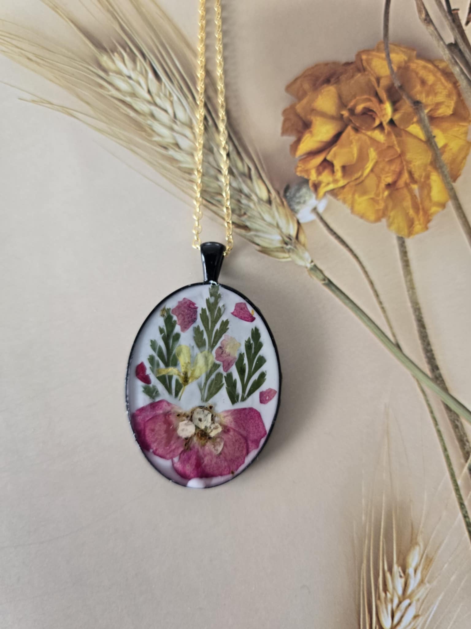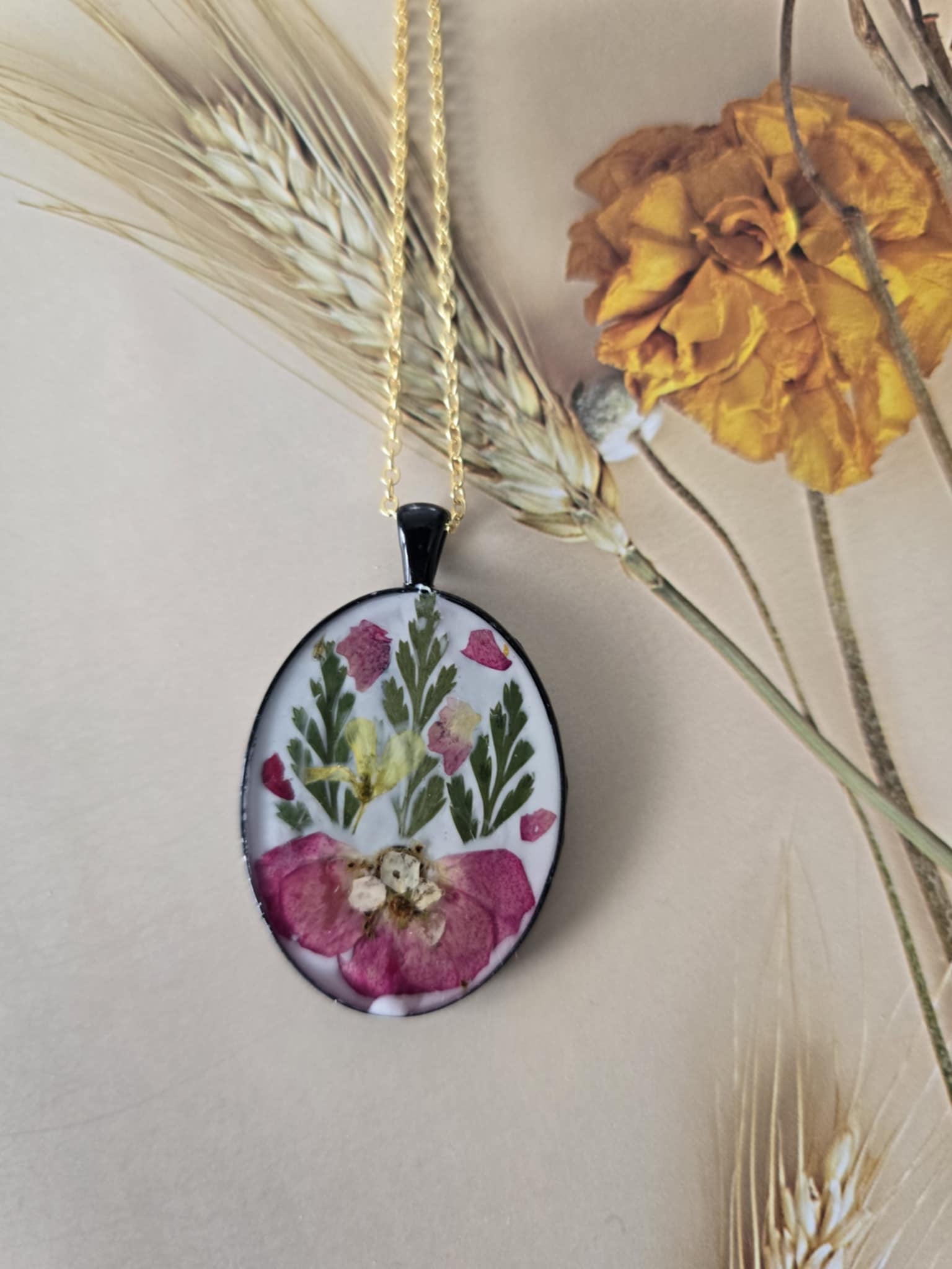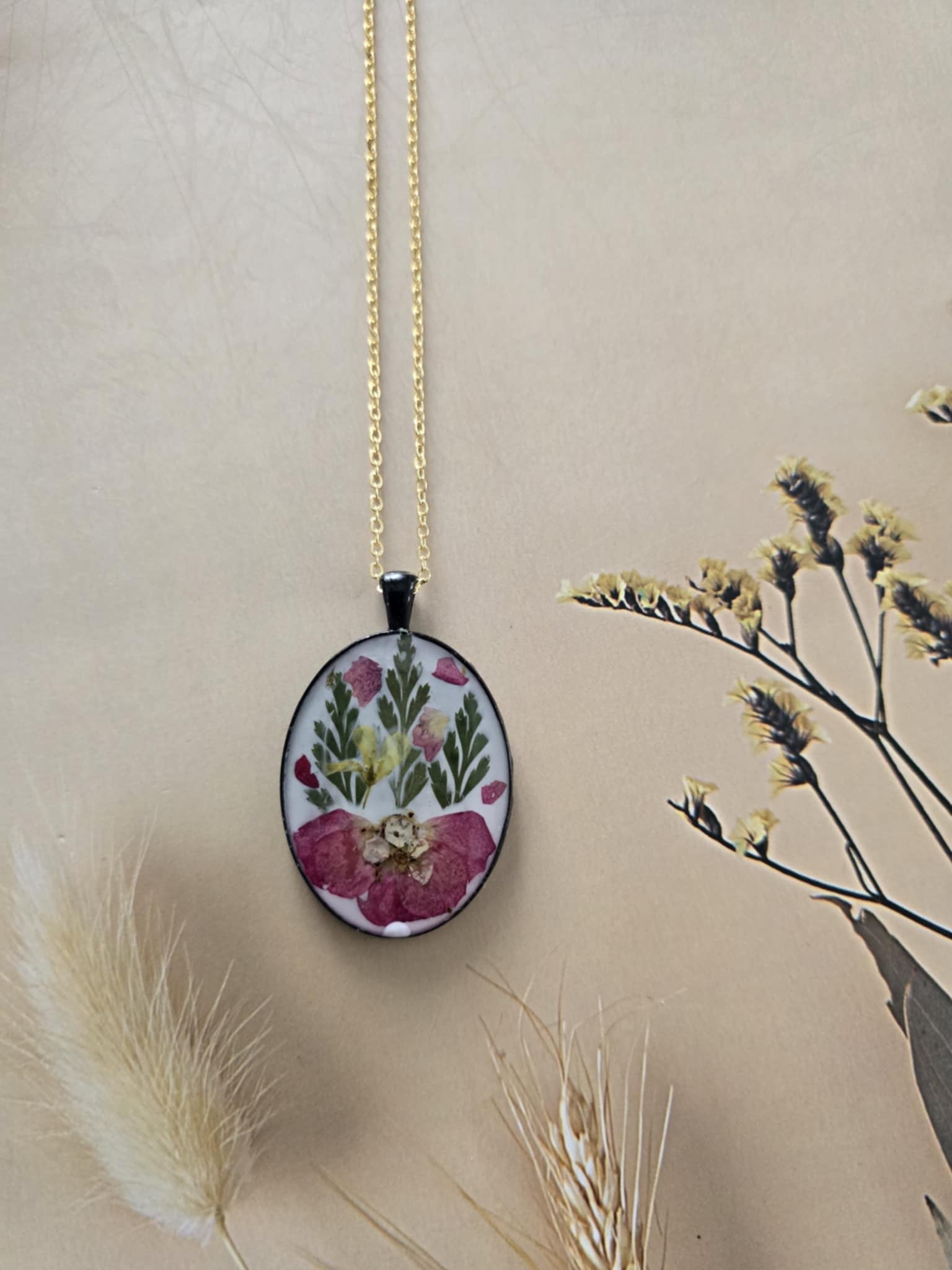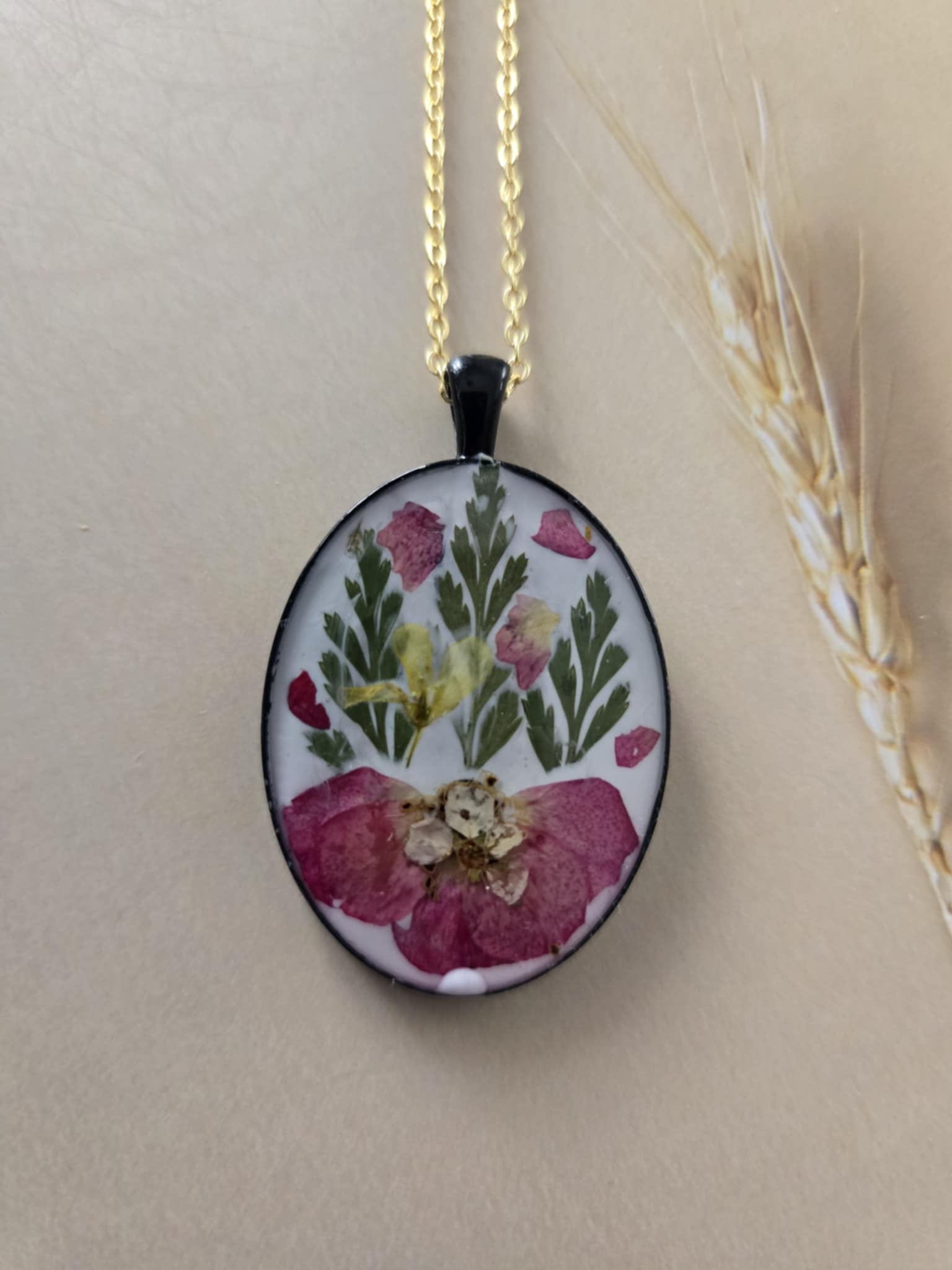 Caractéristiques : une chaîne plaquée or 14 carats ornée de bijoux en résine avec des fleurs naturelles est un accessoire élégant et unique. La résine permet de préserver la beauté des fleurs tout en les mettant en valeur. Ce type de bijou est souvent apprécié pour son aspect artisanal et sa capacité à capturer la nature.